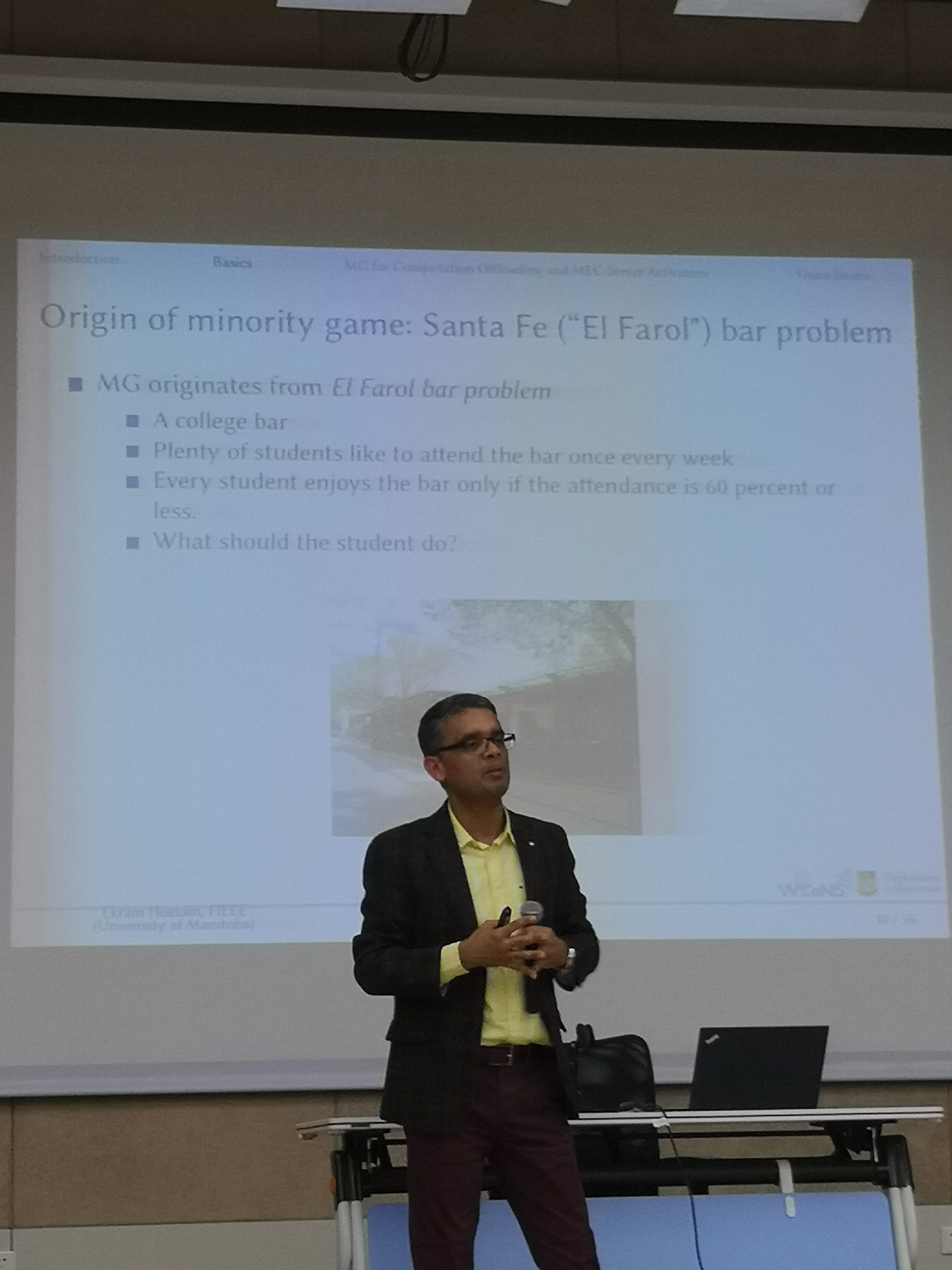 报告会上,Hossain教授对移动边缘计算研究领域内的相关问题进行了深入浅出地讲解,生动有趣地介绍了少数者博弈模型,并详细地讲解了如何运用少数者博弈模型解决移动边缘计算中的计算负载转移和服务器启用等问题。报告内容非常具有启发性。