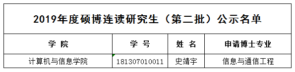 根据《关于选拔2019年度硕博连读研究生(第二批)的通知》(河海校科教〔2019〕17 号)文件精神,按照学校工作安排,经个人申请、专家推荐、学科考核,报学校招生领导小组审定,现将2019年硕博连读研究生(第二批)拟录取名单(附后)公示,公示期10天。