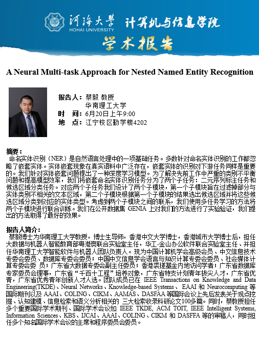 学术报告:A Neural Multi-task Approach for Nested Named Entity Recognition