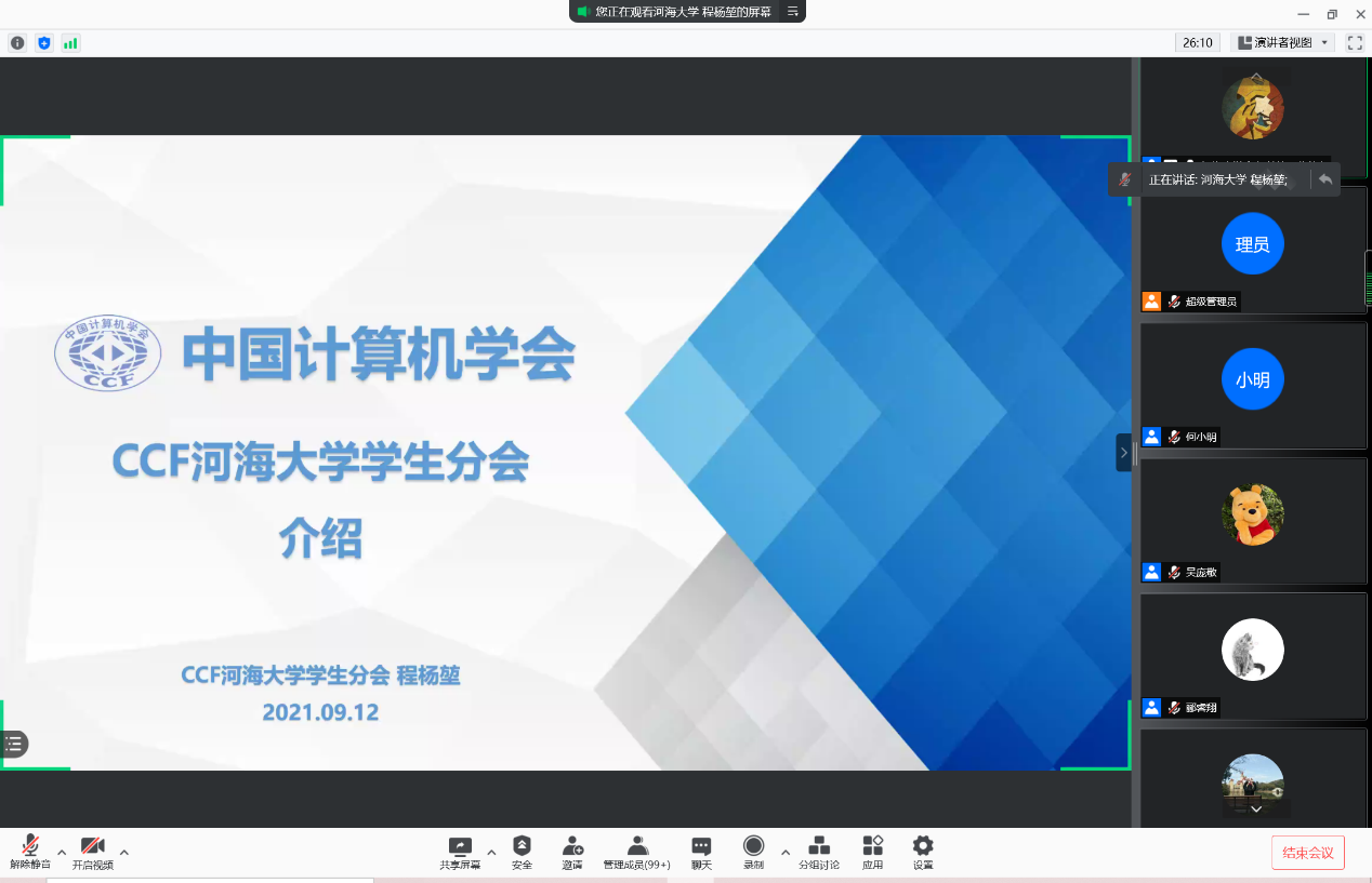 硕士研究生程杨堃介绍了中国计算机学会(CCF)及CCF探花 学生分会的详细情况,鼓励同学们积极加入CCF协会,为自己的研究生阶段增添更丰富的科研经历。