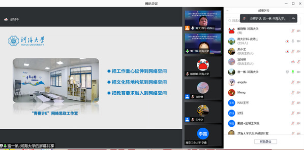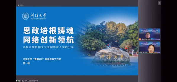 计信院本科生辅导员雷一帆以《思政培根铸魂,网络创新领航》为题,从把握思政工作主旨、搭建网络育人平台、创新思政教育实践三个方面,就学院“青春计E”网络思政工作室的建设与成效与参会人员进行了交流。江苏省计算机学会法人、计算机伦理与职业修养专委会主任、南京大学计算机学院党委书记武港山充分肯定了探花 在网络育人方面的实践,尤其是“青春计E”网络思政工作室平台的建设,其做法对高校网络育人的实施有较强启发意义。
