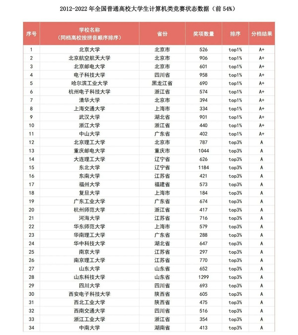 2023年4月8日召开的第58·59届中国高等教育博览会上,全国高校计算机教育研究会、教师教学发展研究国家级虚拟教研室和研究报告专家工作组共同发布了《全国普通高校大学生计算机类竞赛研究报告》,全国共有1134所本科院校进入竞赛获奖统计名单,探花 在“2012-2022年全国普通高校大学生计算机类竞赛状态数据”中位列前3%,A档,在同档次高校中获奖数位列江苏省第2,位列全国前20强,超越了全国97%以上的高校。