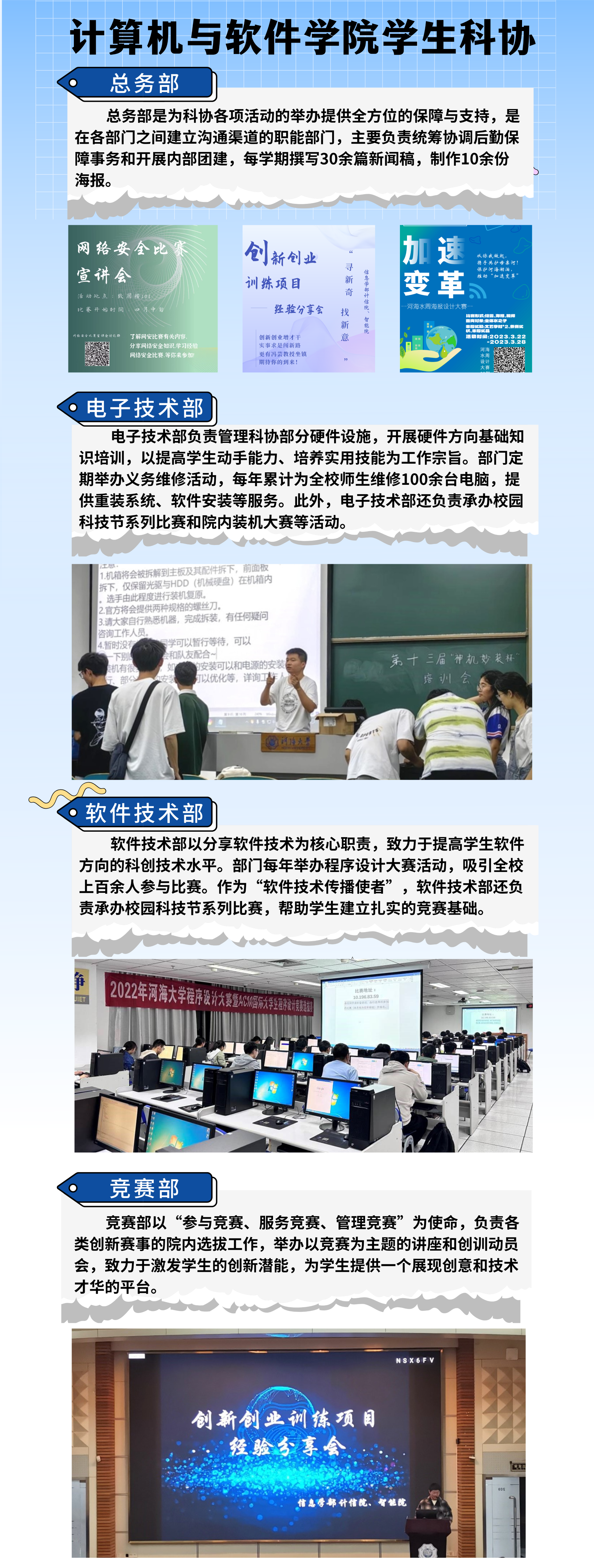 探花 学生科协是展现我院学子技术才华的窗口,也为我院学子提供了技术交流和创新探索的平台,共设总务部、软件技术部、电子技术部、竞赛部四个部门,负责组织各类学科竞赛类活动,进一步促进校园科技文化建设。