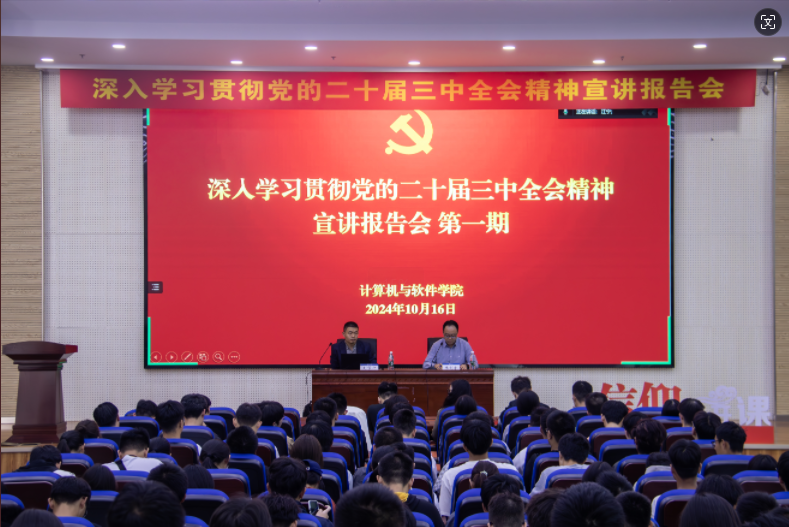 为进一步推动理想信念教育常态化制度化建设,教育引导学生坚定信仰、信念、信心,10月16日,学院在江宁校区举办学习贯彻党的二十届三中全会精神宣讲首场报告会,邀请我校马克思主义学院刘学坤教授作专题辅导。报告会由计算机院党委副书记张剑宇主持,学院辅导员、学生党员、学生骨干以及2024级本科生共300余人参加学习