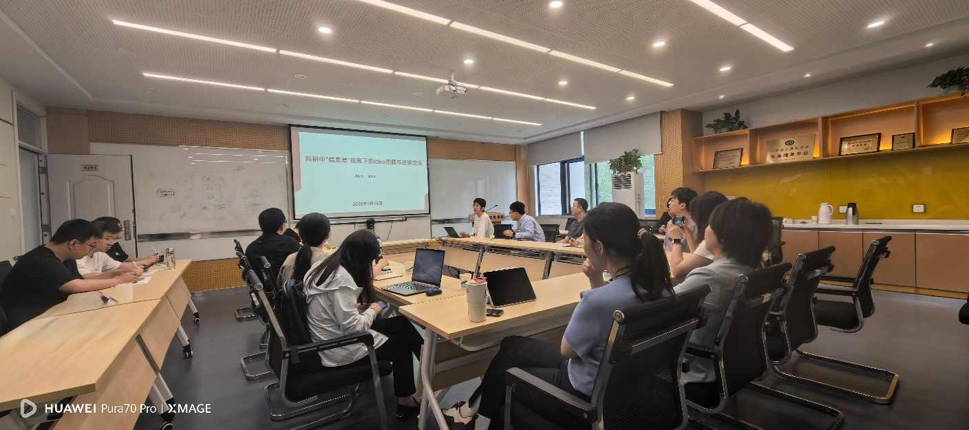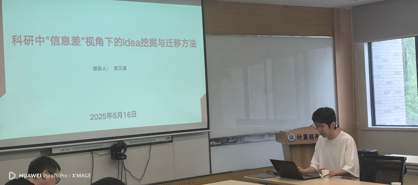 报告环节,学院副研究员张文逍作题为《科研中“信息差”视角下的idea挖掘与迁移方法》的精彩汇报。张文逍副研究员是应用技术专业博士,在点云表征及智能处理等领域成果颇丰,近年来在CVPR、ECCV、TVCG等重要会议期刊发表论文10篇。
