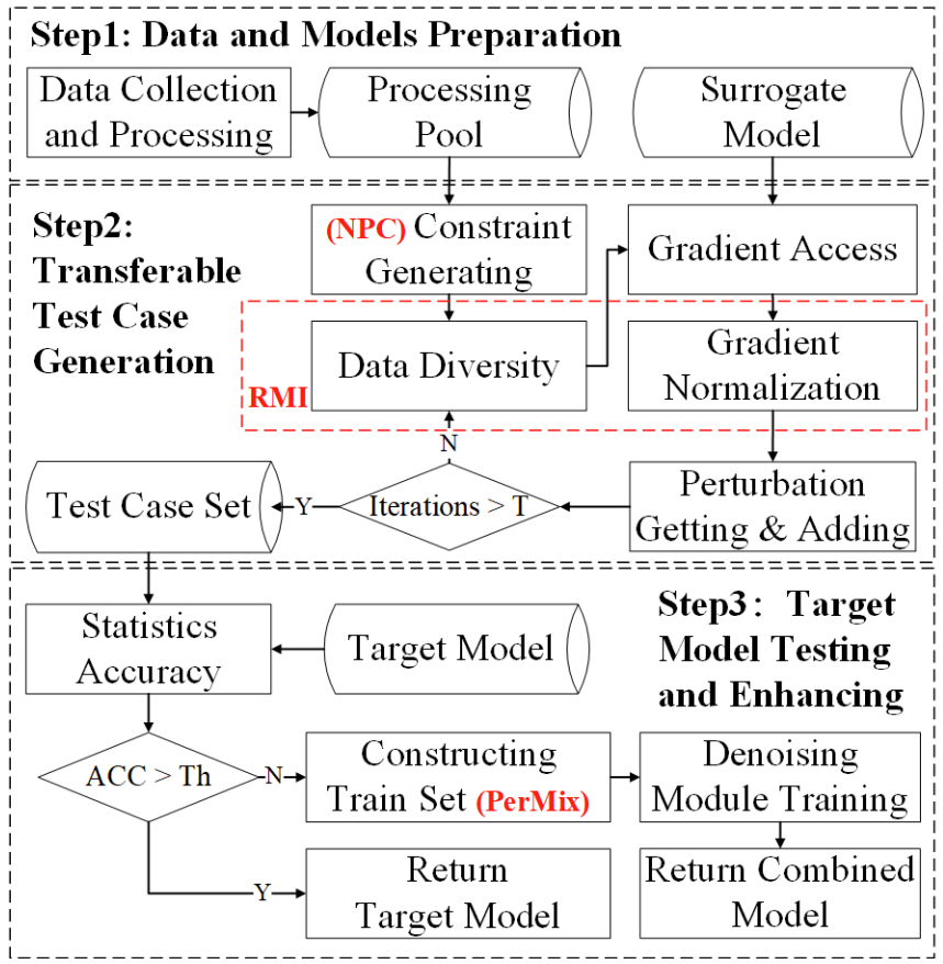 本文提出了一种面向图像分类DNN的测试方法TAEFuzz,该方法通过生成可迁移对抗样本作为测试用例,自动评估并增强DNN的鲁棒性。TAEFuzz通过在不同扰动半径下生成多样化的邻居样本,并使用其梯度修正扰动方向,有效缓解了测试用例生成过程中的过拟合问题,并防止陷入局部最优。此外,通过对图像敏感区域的扰动进行约束,TAEFuzz显著提升了测试用例的视觉质量。TAEFuzz还利用低成本的数据增强技术构建数据集来训练去噪模块,对输入数据进行噪声消减,增强了模型的鲁棒性。